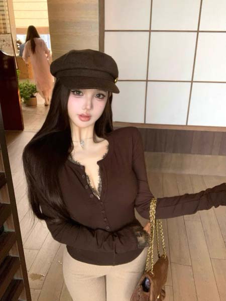 2025年11月18日入荷秋冬新作SAINT LAUREN*パッチワークレース偽の2枚のvネック長袖Tシャツ女性の秋の細身の腰にぴったりです